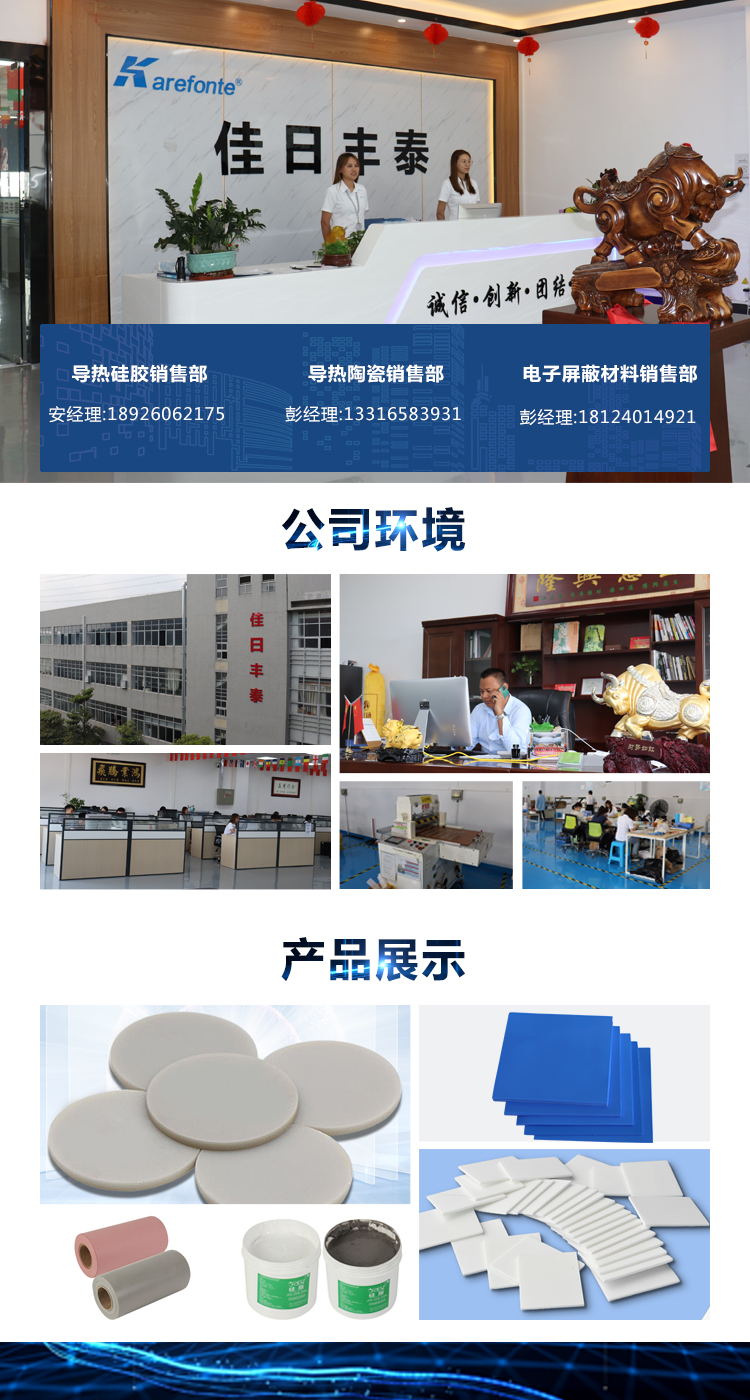 深圳市佳日丰泰电子科技有限公司成立于2010年,隶属佳日丰泰集团(香港)有限公司旗下的子公司,是一家专业致力于电子导热绝缘材料研发、生产、销售为一体的高科技企业。公司主营四大系列产品:一、导热硅胶系列:(高)导热硅胶片、(高)导热矽胶布(片)、导热灌封胶、RTV单组分硅胶、导热硅脂、导热泥、硅(矽)胶管、TO-22美国贝格斯全系导热材料:导热硅胶垫片、矽胶布K4,K6,K10、相变材料等;其产品通过SGS、UL等多项产品认证,产品长期畅销于欧美、东南亚等多个国家和地区,目前公司已通过0、TO-3P绝缘帽套、导热双面胶;二、导热陶瓷片系列:氧化铝陶瓷片(常规TO-220,TO-3P,陶瓷产品都可接受来图加工定做;三、电磁屏蔽系列:NFC铁氧体片、吸波材料可定做加工;四、ISO9001质量标准体系认证。