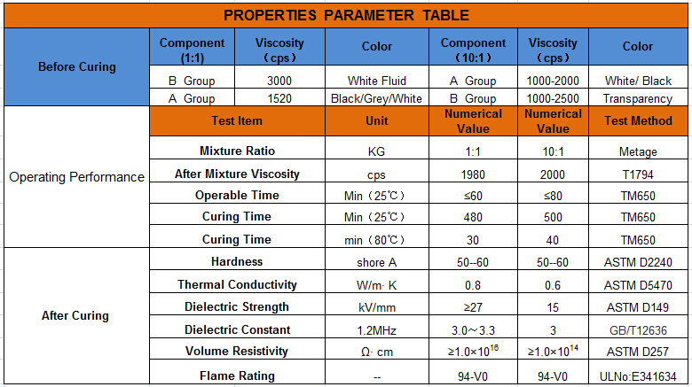 Two-component thermal silicone encapsulants , use imported organic silicone as the main material , select the polymer materials as fillers, manufactured electronic pouring sealant . It has heat conducting , flame retardance, adhesion , sealing, waterproof, encapsulation properties .