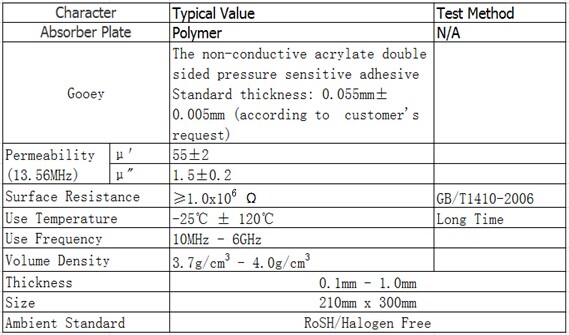 JRF-GF2000B Wave absorbing materials with high permeability and low loss. This feature can play the role of the bunching of flux, for 13.56MHz and the following frequency RFID (radio frequency identification) and NFC (near field communication) technology, provide the effective solutions for antenna under the metal background , the interference tag / reader to read and write properly.